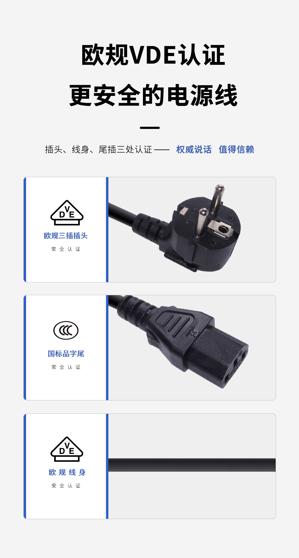 VDE 3-Pin 欧规插头 开线 电源线组 1.2米